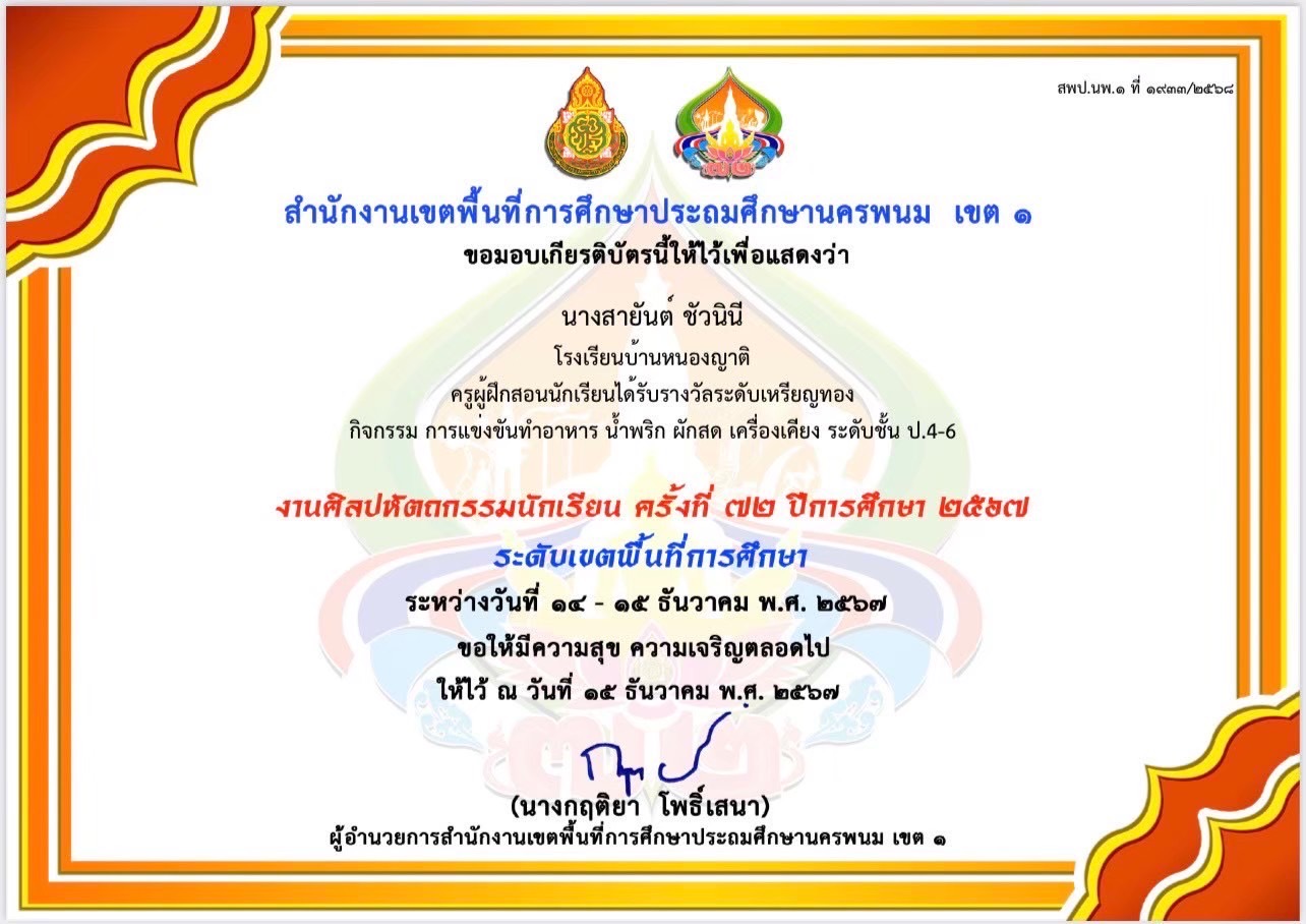 รางวัลเหรียญทอง กิจกรรม การแข่งขันทำอาหาร น้ำพริก เครื่องเคียง ระดับชั้น ป.4-6